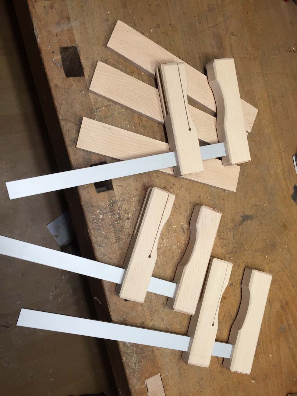 Nun habe ich angefangen mir ein paar dieser Schnellspannzwingen selbst zu fertigen. Bis auf den Exzenter und noch ein paar Bohrungen für die Federhülsen sind diese auch soweit fertig. Um ein Rutschen der Hölzer zu verhindern, wird zum Schluss noch auf die Druckflächen ein Stückchen Kork geklebt.