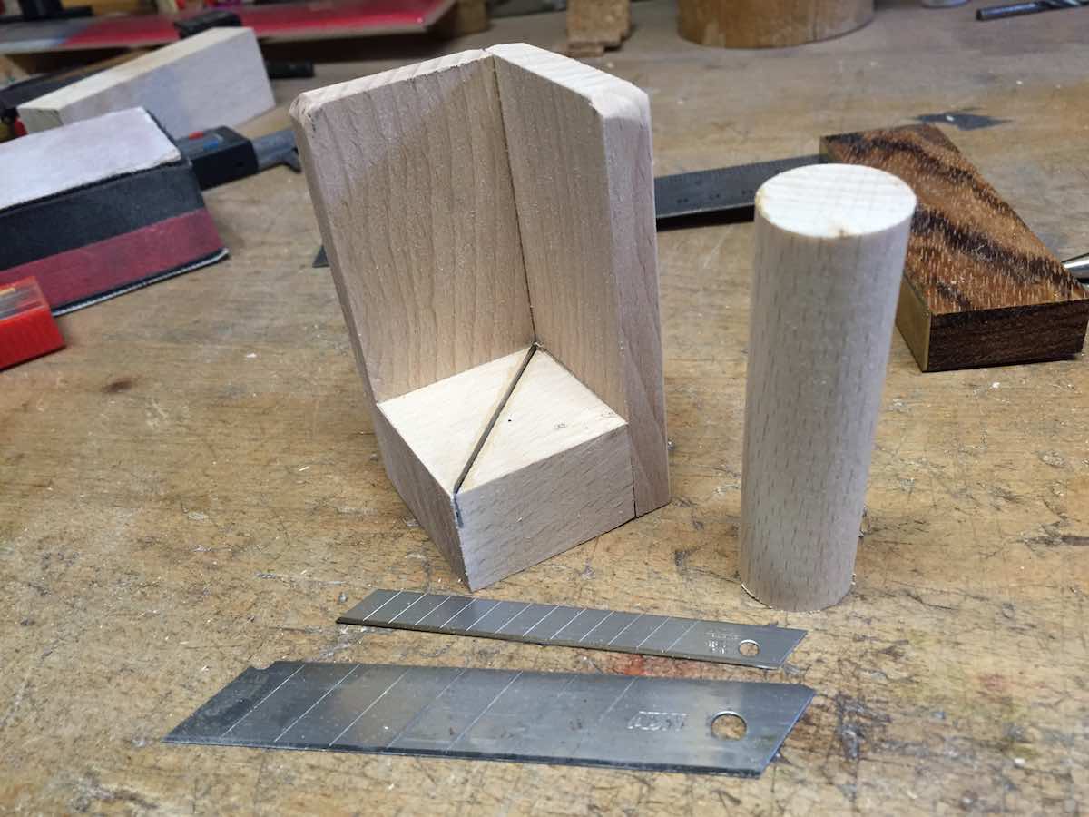 Nichts einfacher als das. Ein quadratisches Stück Holz, diagonal einen Schnitt mit einem feinen Sägeblatt und da hinein eine Klinge wie im Bild geklebt. Die Schneide sollte ca. 1mm aus dem Holz stehen. Seitlich noch zwei Brettchen angeklebt, so dass das Holz im rechten Winkel steht Fertig .