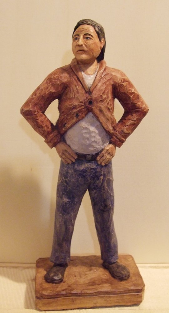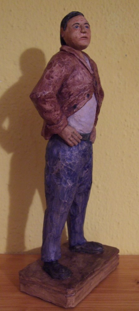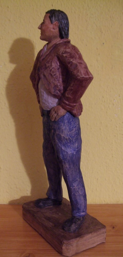 Die vielen kleinen Schnitte an Hose und Jacke, lassen die Figur etwas unruhig erscheinen. Ein großes Eisen mit einem klaren Schnitt und betonten Falten wäre besser. Ansonsten ist dir diese Arbeit sehr gut gelungen. Sehe das bitte nicht als Kritik an deiner Arbeit, sondern nur eine Empfehlung aus meiner Sicht.