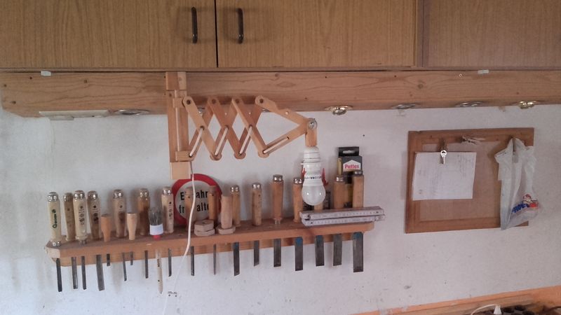 die Beleuchtung in einem relativ dunklem Raum zum Schnitzen ist sehr wichtig, da letztlich durch den Schattenwurf des künstlichen Lichtes Täuschungen beim schnitzen hervorgerufen werden können. Nicht jeder ist in der glücklichen Lage zum Schnitzen das Tageslicht nutzen zu können und man muss sich somit des Kunstlichtes behelfen.