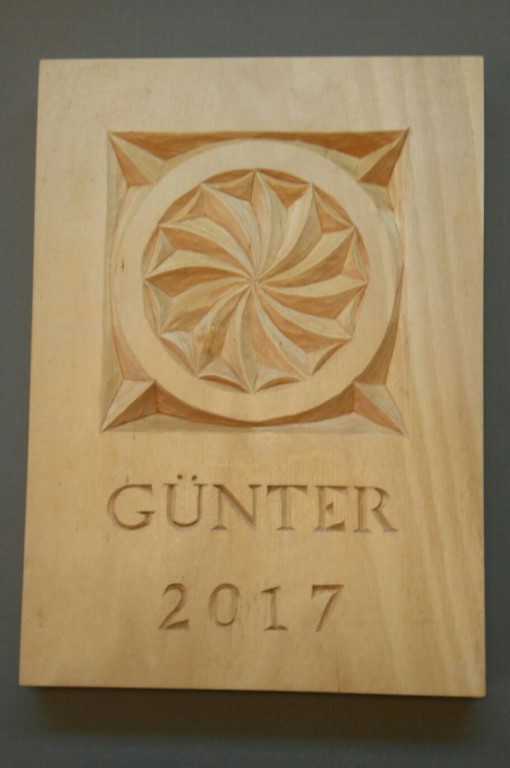 Die Rosette ist natürlich auch ganz toll geworden. Auch wenn dir bei der Schrift ein Freund behilflich war, ist das vollkommen in Ordnung, denn es braucht alles seine Zeit und mit dem Schnitzen von Schriften kann man sich zu einem späteren Zeitpunkt befassen.