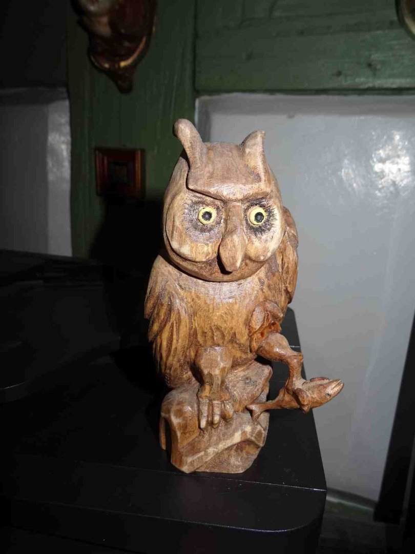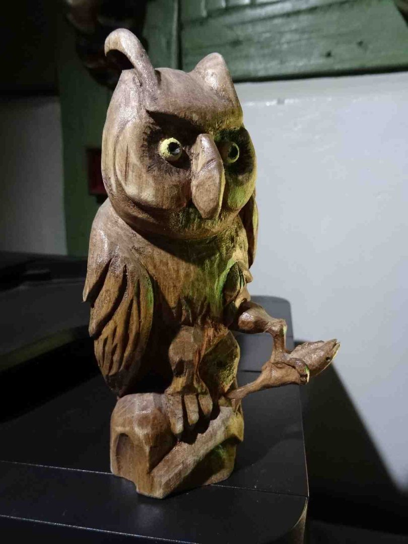 vor längerer Zeit habe ich auch mal so einen " Nachtvogel " geschnitzt ; die Augen leuchten , weil ich da in ein wenig Klarlack ein fluoreszierendes Pulver mit eingemischt habe ... aber der grundsätzliche Fehler ist : die Kralle / Fuß