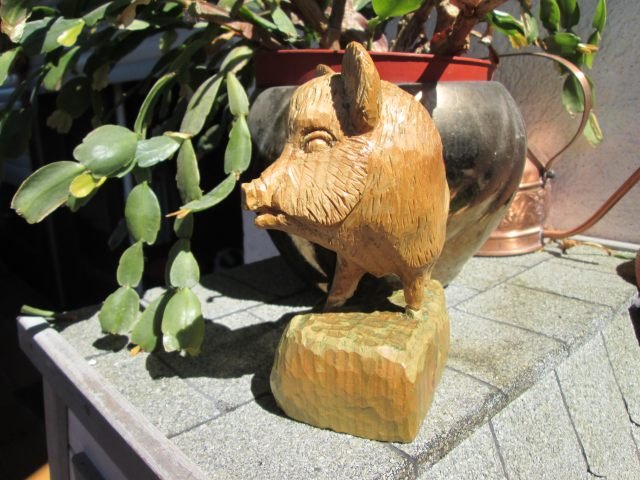 Das ganze Wildschweinchen etwas dunkler machen ( mit Ölfarbe , da die länger " offen " bleibt und dann mit einem Holzzahnstocher kurze , kräftige Borsten herausreiben / kratzen , die dann den Untergrund wieder erscheinen lassen ; es sieht dann aus - durch das die " Kratzer " dann wieder hell werden , wie die Original - Wildsau und die Hauer / Zähne dann auch etwas hell abreiben .