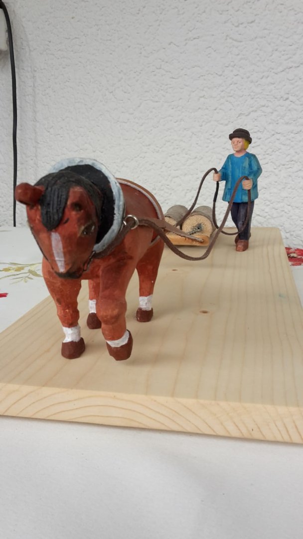 toll ist es geworden, dein Pferd mit dem Bauern und den Stämmen. Auch den Bauern hast du zum Schluss gut hinbekommen. Auch das Gesicht passt für die Größe.